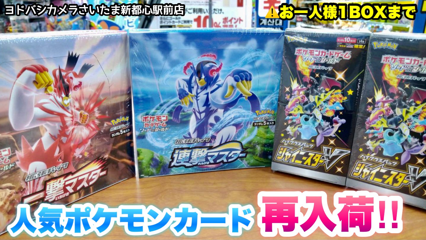 ヨドバシカメラ さいたま新都心駅前店 ポケモンカード 再入荷 シャイニースターv 連撃マスター 再入荷しました 最新パックの一撃マスターも在庫あり 数に限りがありますので お早めに お一人様1boxまでとさせて